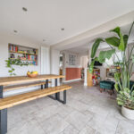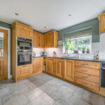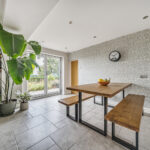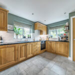 Inside, the property opens into a light-filled open-plan kitchen and living area, perfectly designed for everyday family life and entertaining alike. The kitchen is fitted with high-quality Neff appliances, including two ovens, offering both style and functionality for keen cooks. From the dining area, newly installed bifold doors lead seamlessly out to the patio, creating a wonderful flow between indoor and outdoor living. A separate reception room, complete with a cosy wood-burning stove, provides the ideal spot to relax, while a downstairs bathroom and separate utility area add practicality.