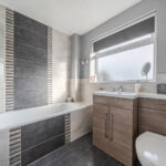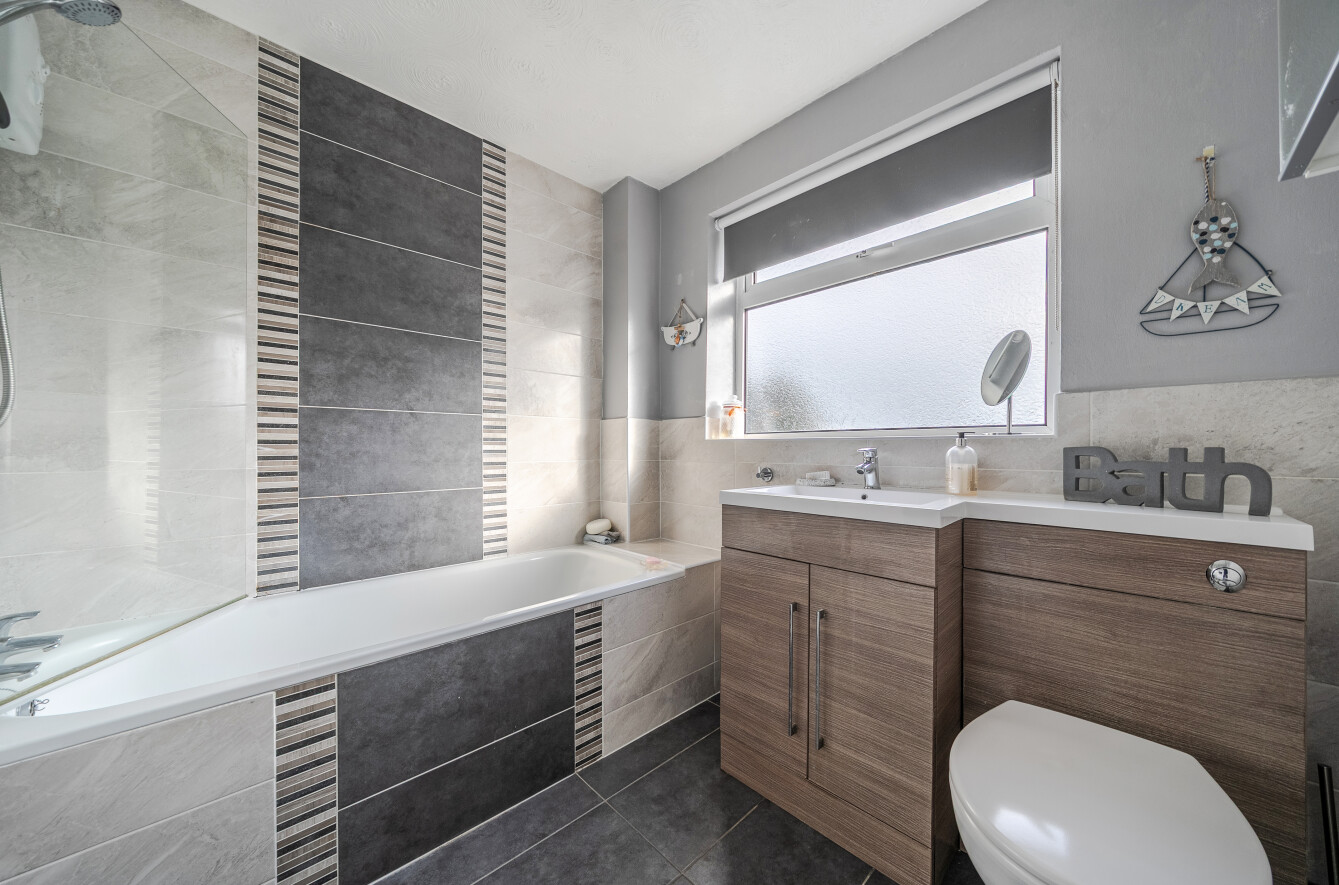 The family bathroom has been modernised to a high standard, finished with contemporary tiling, vanity storage and a bath with shower over.