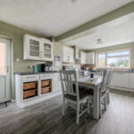 The kitchen/dining room is particularly impressive, generous in scale and thoughtfully laid out. Modern white cabinetry, extensive work surfaces and integrated appliances combine practicality with style. There is ample space for a full dining table, making it an ideal family hub. A side door provides additional external access.