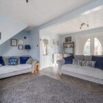 Upon entering, you are welcomed into a spacious and beautifully maintained living room. The décor is soft and contemporary, complemented by herringbone-style flooring and a feature fireplace that creates a natural focal point. The room is light-filled and inviting, a true family space.