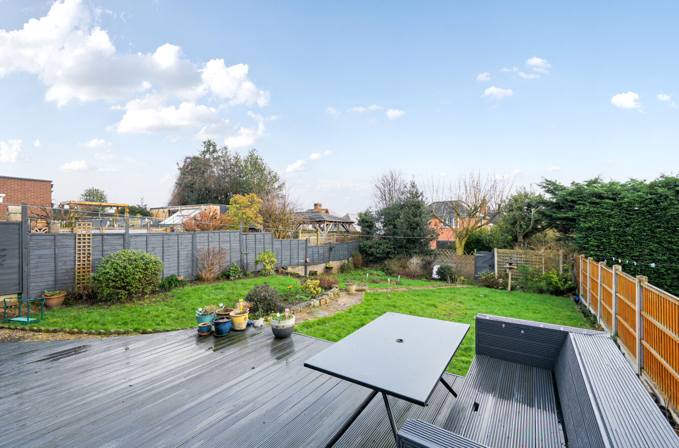 The rear garden is a genuine highlight and offers excellent depth compared to many similar homes. A raised composite decking area provides an ideal entertaining platform directly accessed from the garden room. Steps lead down to a generous lawn bordered by mature shrubs and fencing, creating a private and secure environment ideal for children and pets.