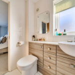 The ground floor also benefits from a contemporary bathroom, featuring a feature basin with Grohe tap and an enclosed WC with built-in cabinetry.