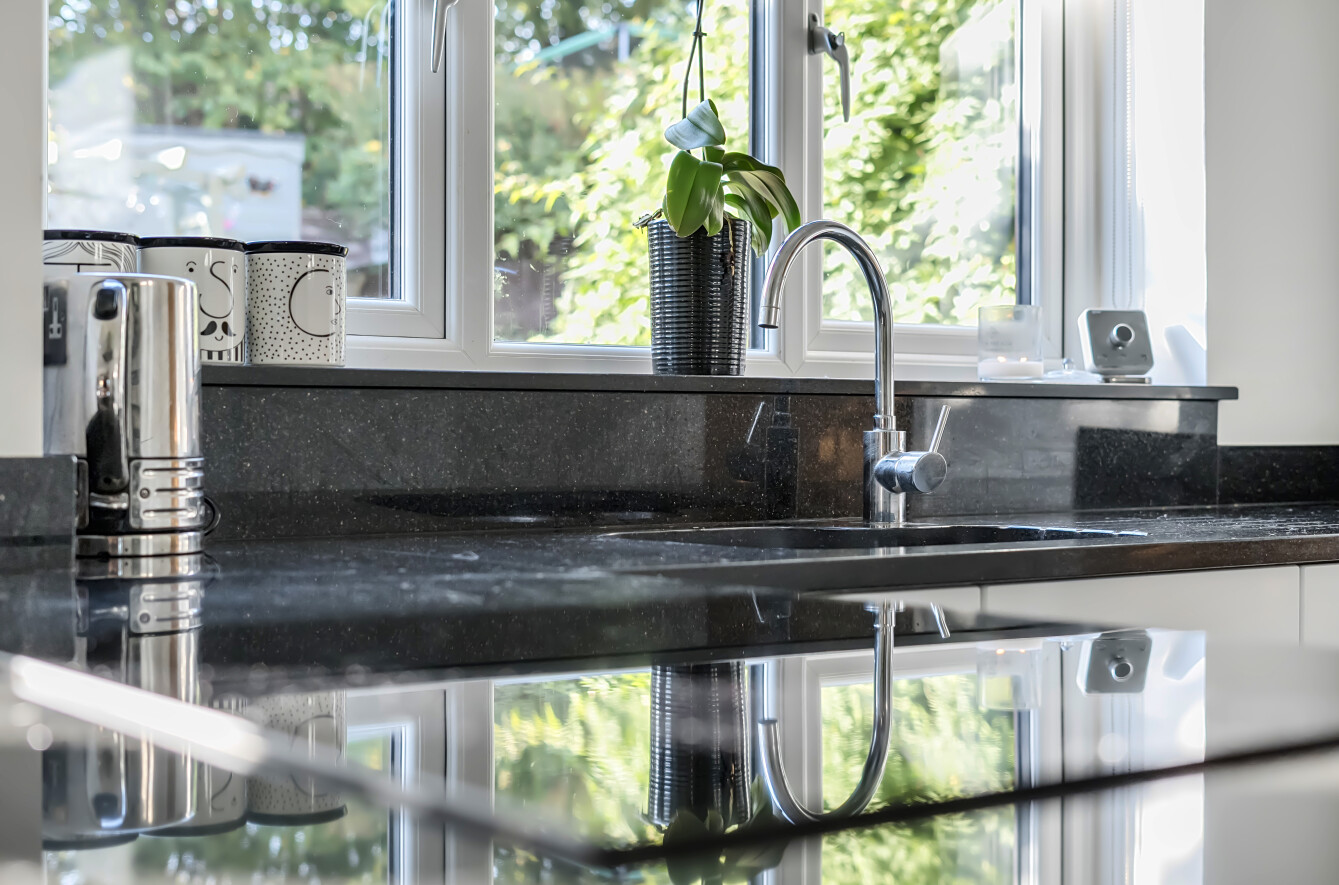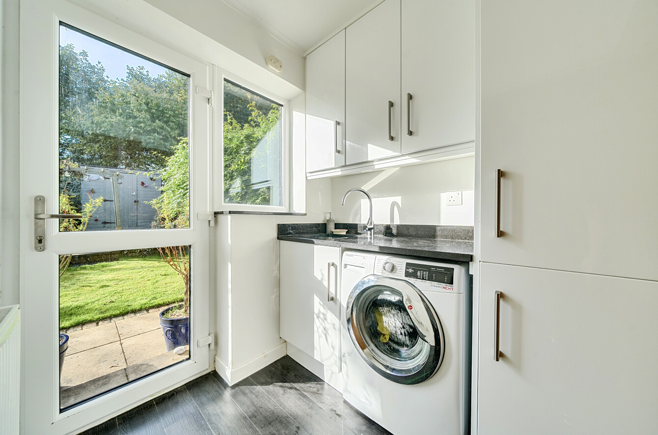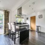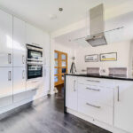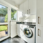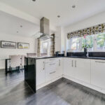 The entrance hallway features elegant oak veneer flooring, leading into a spacious lounge carpeted in luxurious Cormar wool, extending upstairs for continuity and comfort. The heart of the home is the modern kitchen/dining area, fitted with Karndean flooring, granite “Black Galaxy” worktops, and a suite of high-quality appliances, including a Neff frost-free fridge-freezer, Neff induction hob with extractor, and Whirlpool dishwasher. A one-and-a-half stainless-steel sink with Grohe mixer tap completes this stylish and functional space. The adjoining utility room provides additional Karndean flooring, a stainless-steel sink with Grohe tap, and space for either a washing machine or washer-dryer.