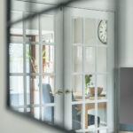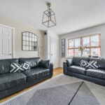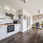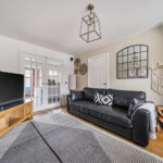 The principal living room is an elegant and well-proportioned space, finished with warm wood flooring and neutral décor. Double glazed French doors open seamlessly into the kitchen/dining area, creating flexibility for both open-plan living and cosy separation when desired. This is a superb space for entertaining or relaxed family evenings.