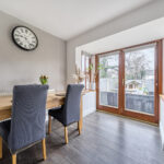 A defined dining area sits adjacent to French doors leading directly onto the patio and garden, allowing indoor-outdoor living in the warmer months. The proportions comfortably accommodate family dining and hosting alike.