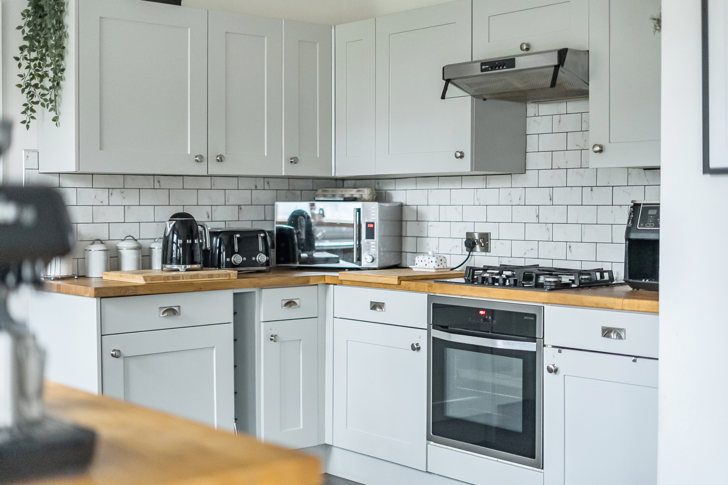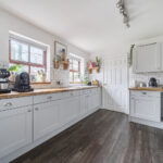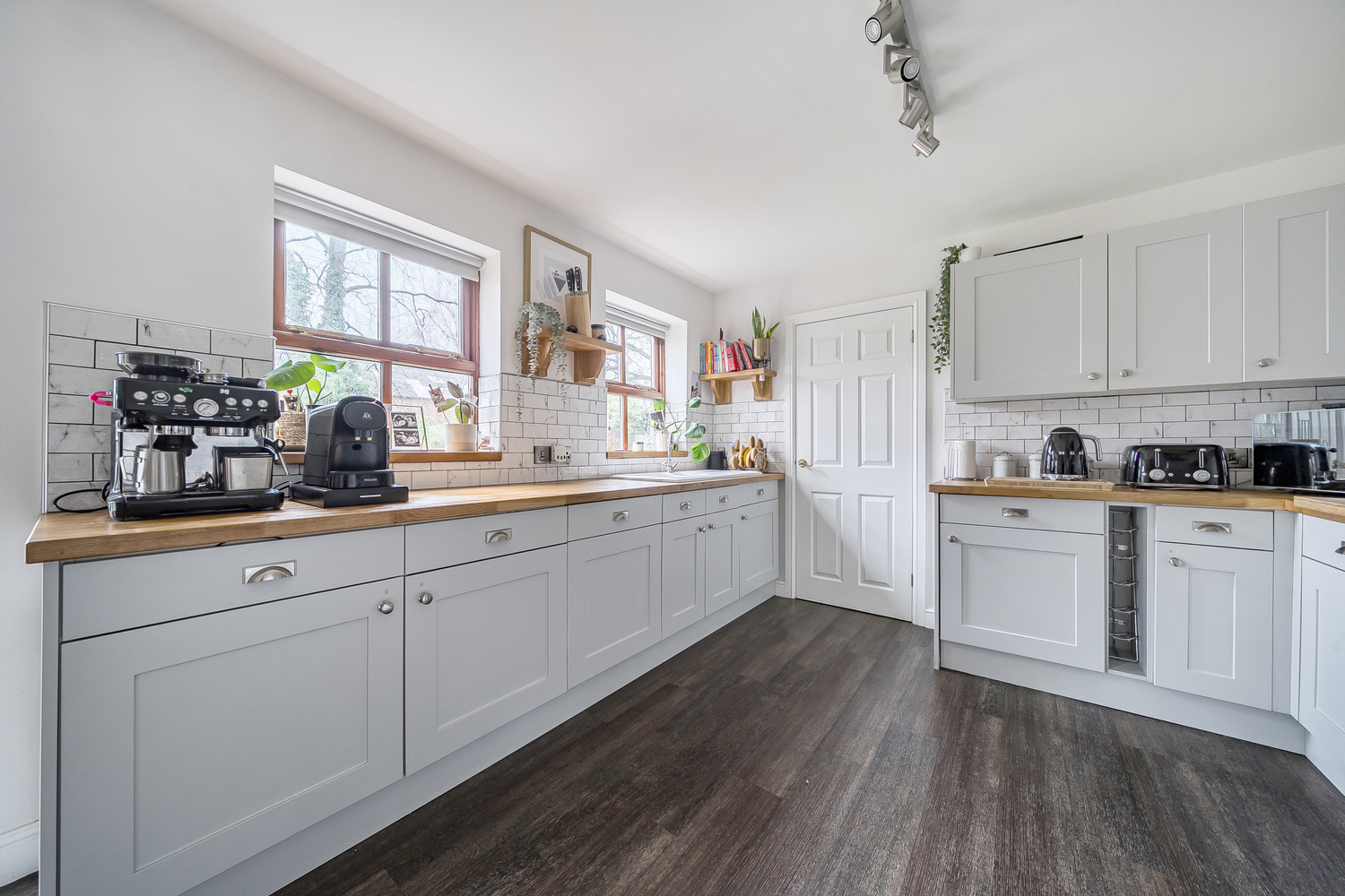 The kitchen is a true heart-of-the-home space — generously sized and beautifully appointed with shaker-style cabinetry, wood worktops and contemporary tiled splashbacks. Dual windows provide excellent natural light, while the layout offers extensive preparation space and storage.