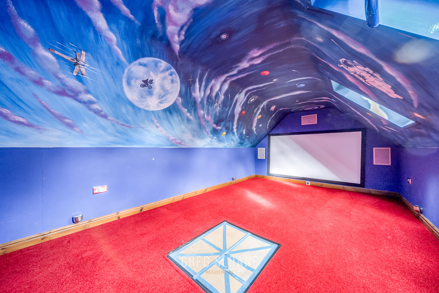 Upstairs, the galleried landing leads to four bedrooms and the family bathroom. Two are generous doubles, with the main featuring its own en-suite shower room. On the top floor, two additional bedrooms add even more versatility – the larger of which is currently a home cinema room (and yes, the kids will think you’re the best parents ever).