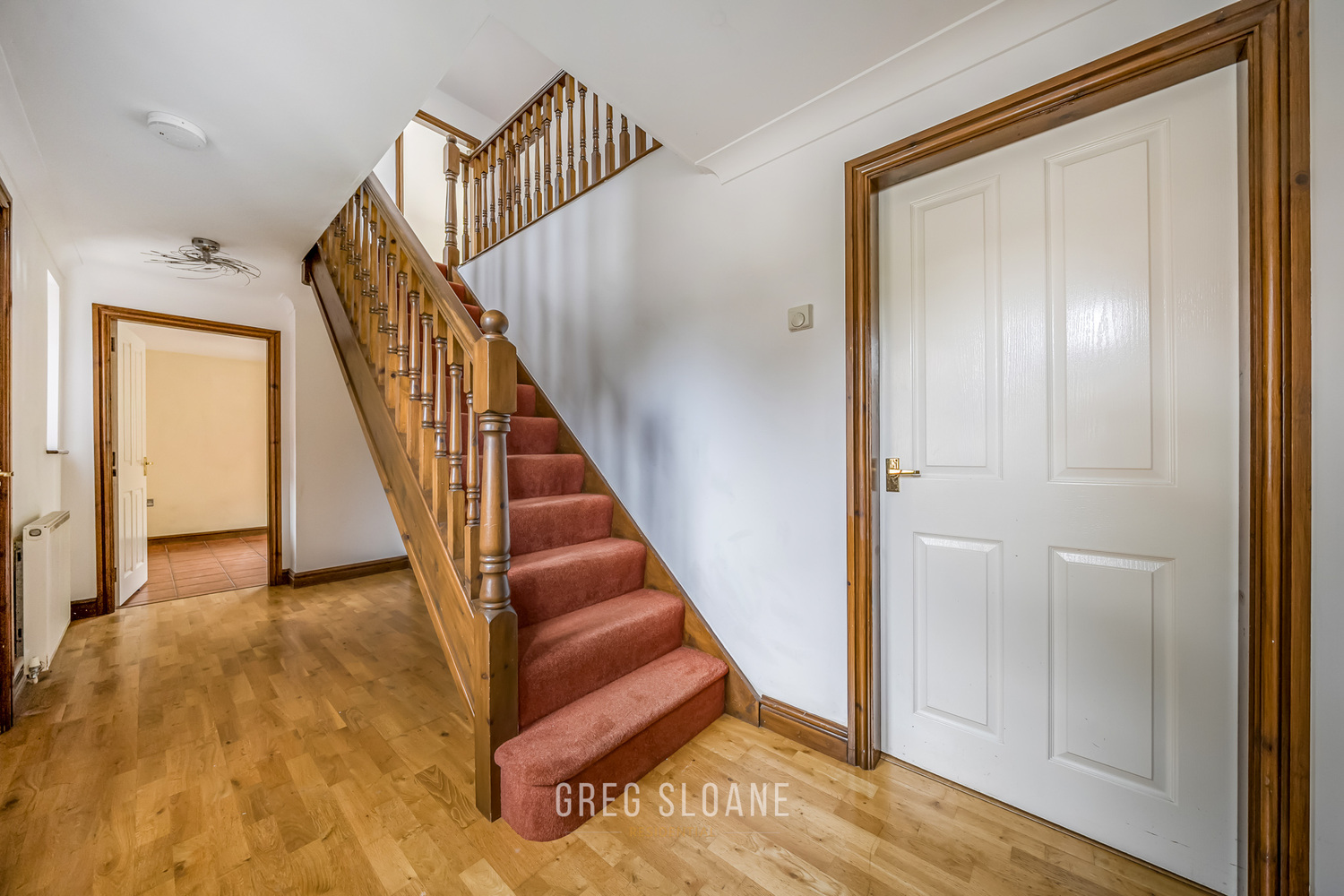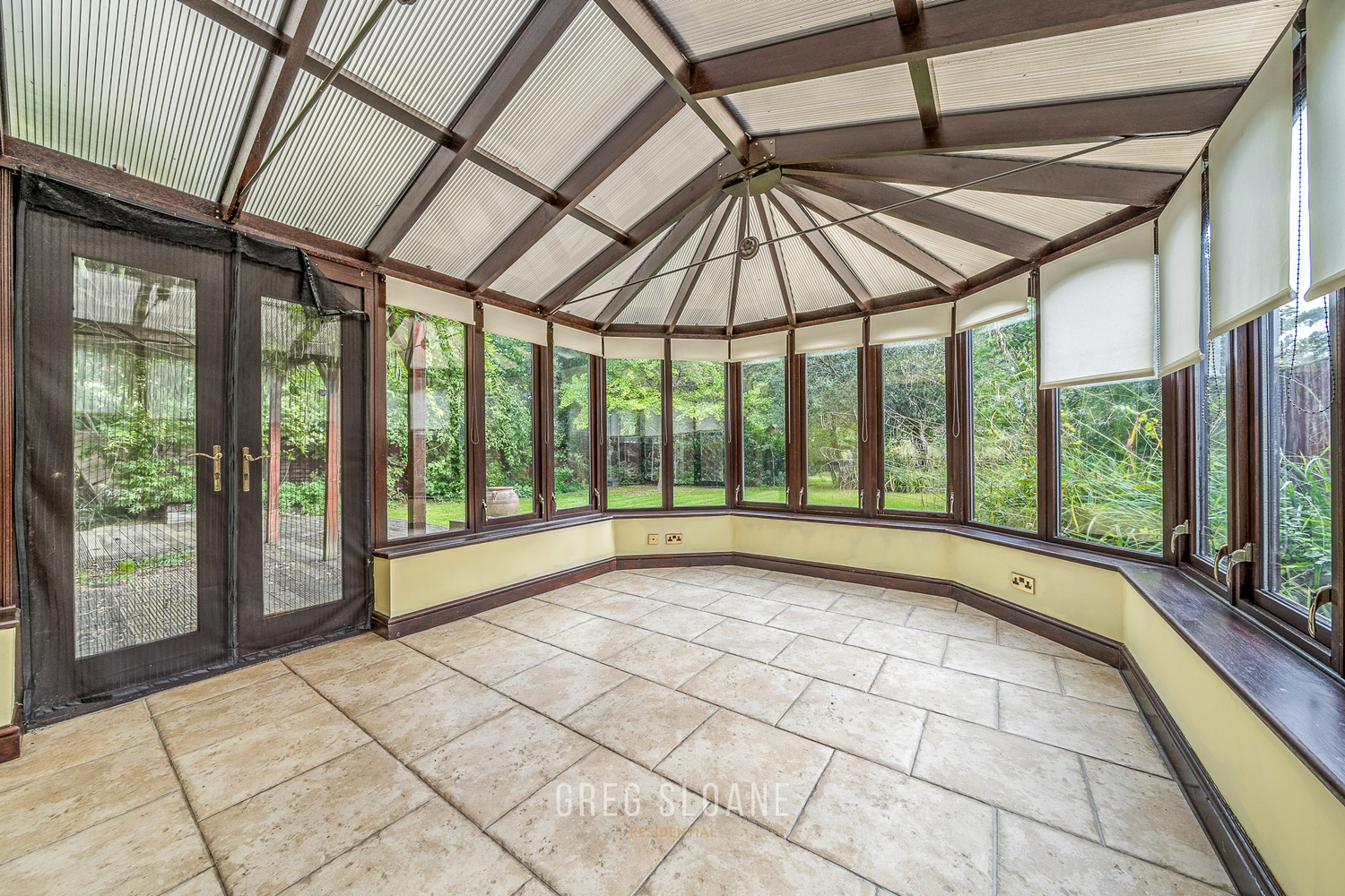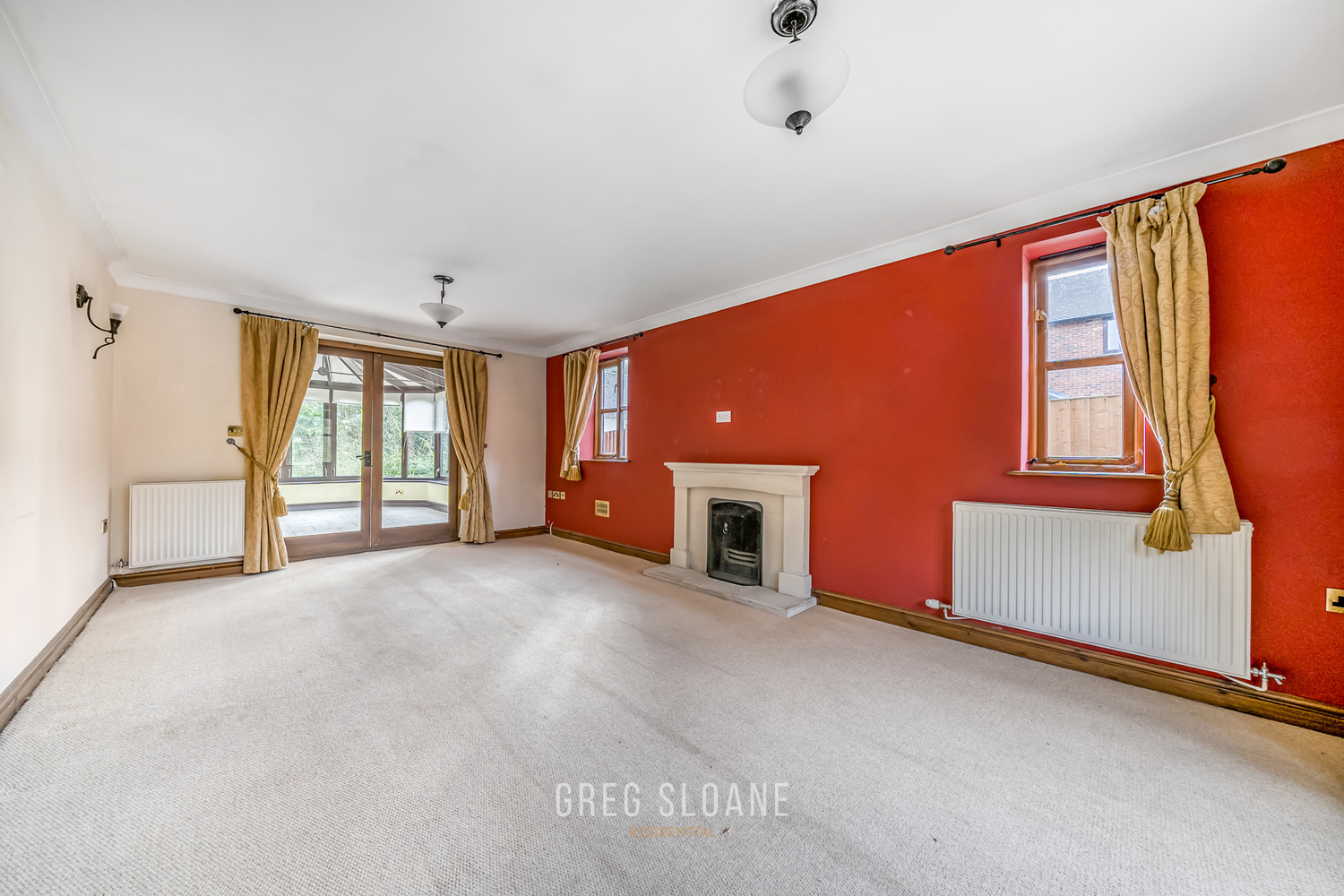 Step into the generous central hallway and you’ll instantly get a sense of the proportions here. The main living room runs the full depth of the house, filled with natural light from its dual aspect windows, and centred around a fireplace that promises cosy evenings. A large conservatory extends the living space, spilling out into leafy garden views – the perfect spot for a morning coffee or a book in the afternoon sun.