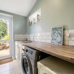Fitted with a range of cream shaker-style wall and base units with wood-effect worktops. 1½ bowl stainless steel sink and drainer with mixer tap, set beneath a window overlooking the rear garden. Modern metro-tiled splashbacks. Integrated dishwasher, double oven, ceramic hob with extractor above. Ample space for dining furniture and further seating. Log-burning stove with tiled log store. Aluminium bi-fold doors leading to the rear garden, skylights, and engineered timber flooring throughout. Door to the utility room.