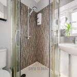 Corner shower unit with electric shower, WC, hand basin, tiled splashbacks, heated towel rail, window to the rear aspect.