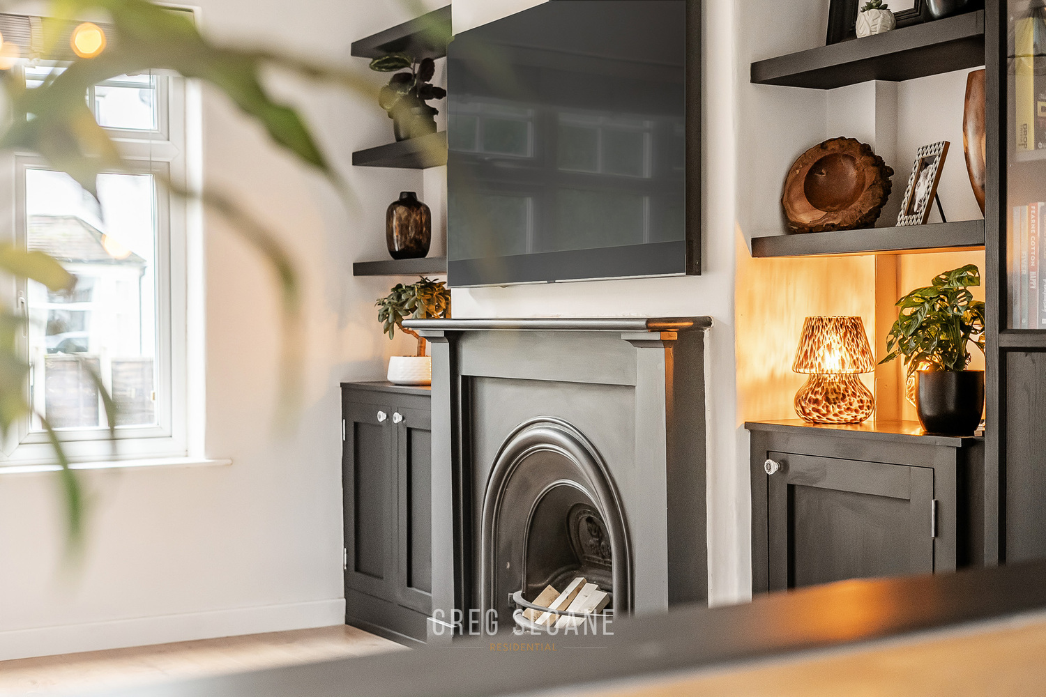 The living room is a generous size, with a lovely open fire as its focal point – perfect for snuggling up in the evenings. Alcoves with built-in storage add to the charm.