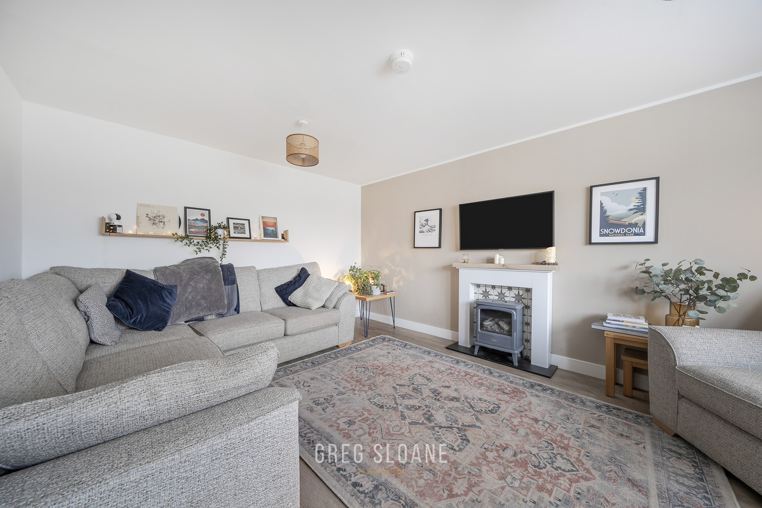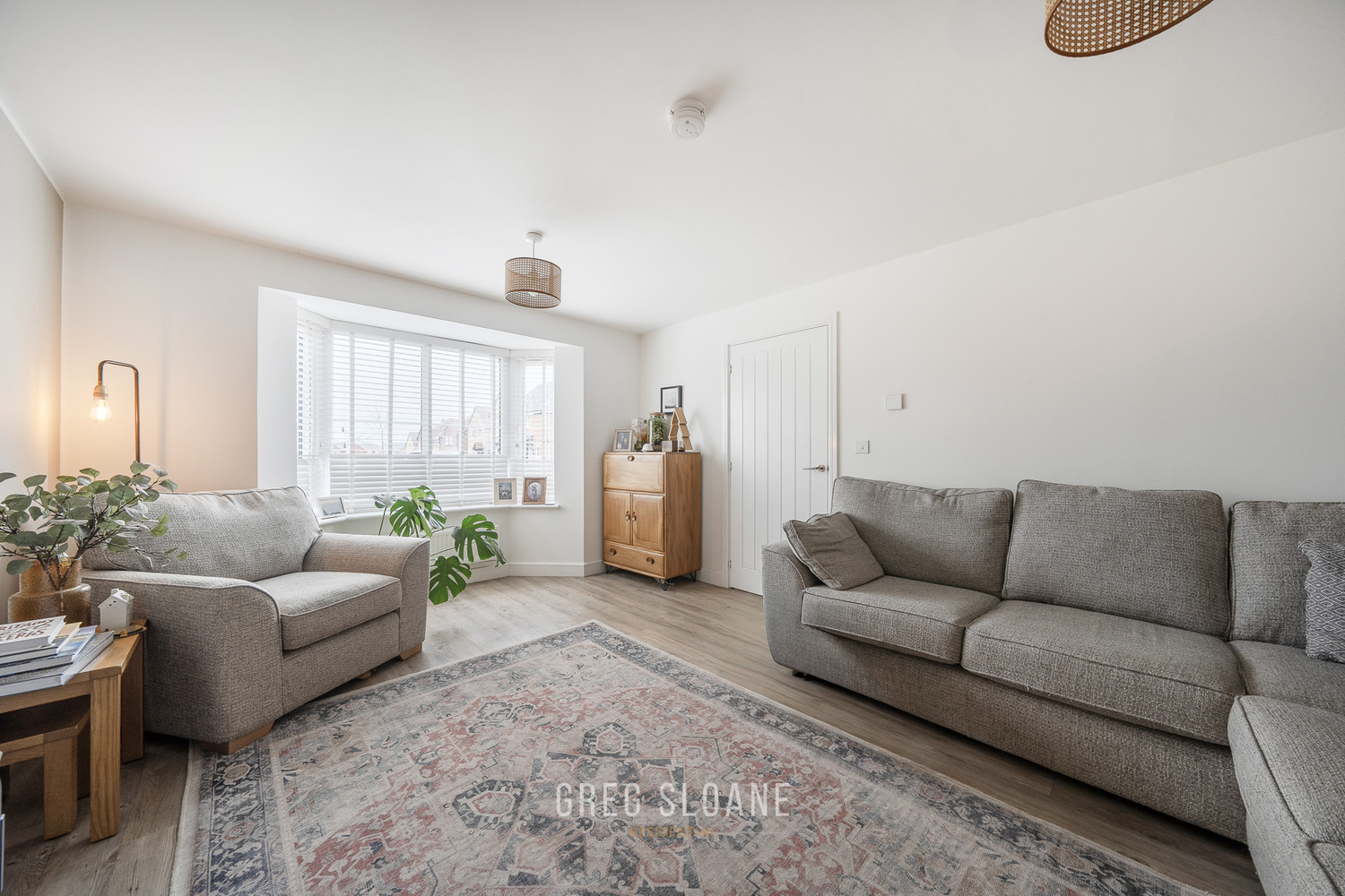 Step inside and you’re welcomed into a central entrance hall which leads through to the heart of the home. To one side is the living room – a wonderfully bright and comfortable space, enhanced by a bay window overlooking the green.