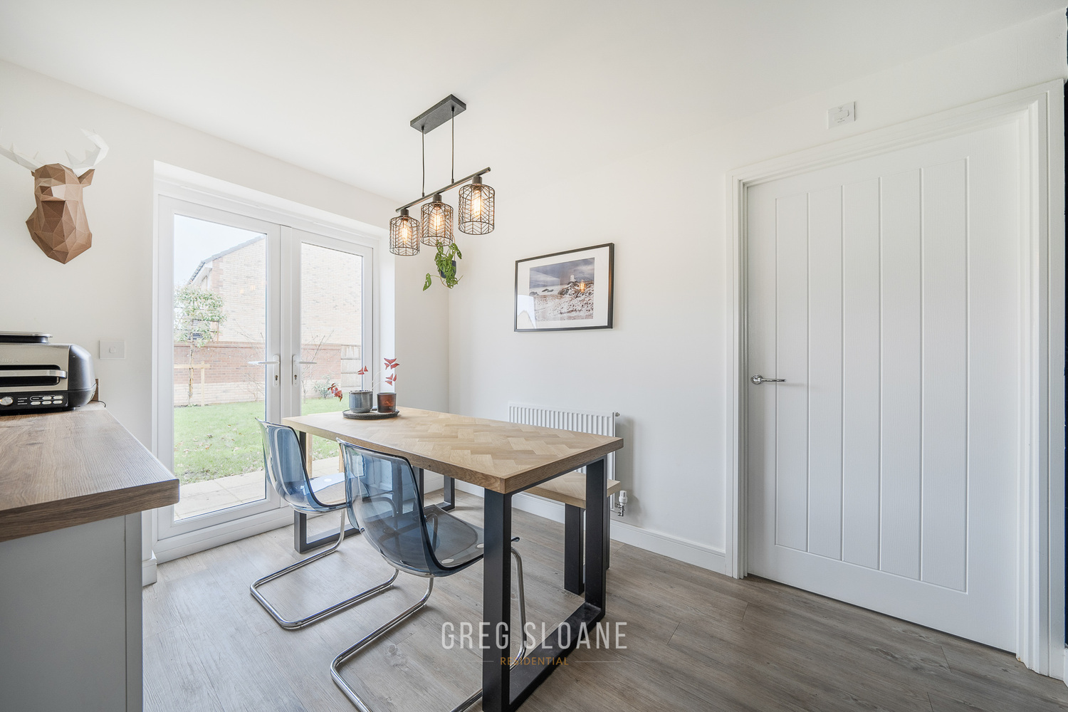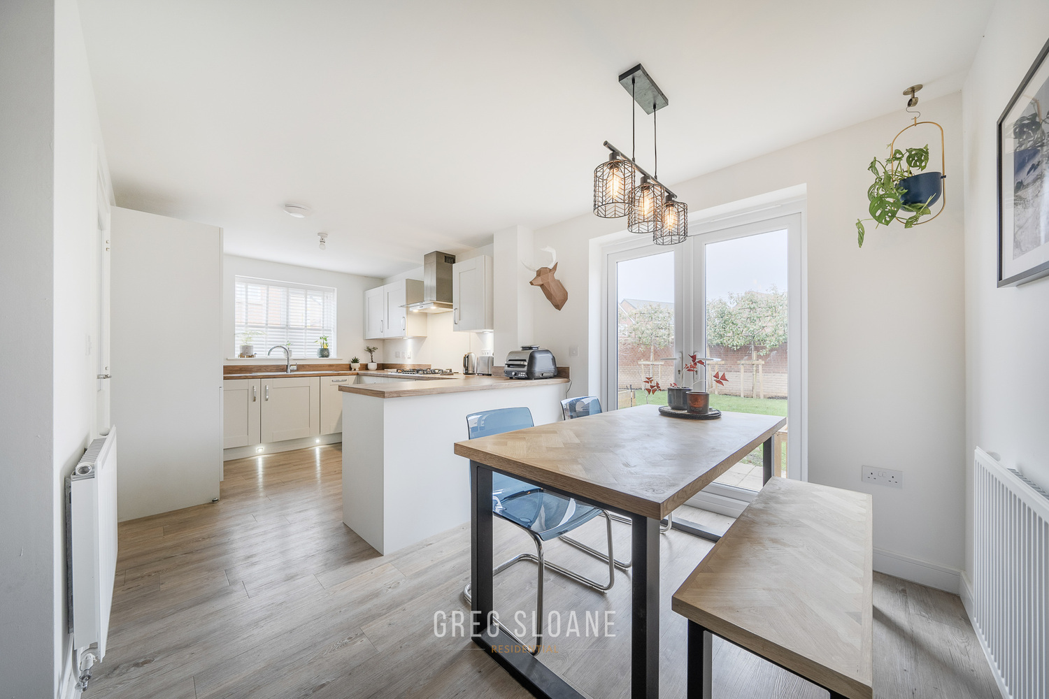 To the rear, the kitchen diner provides a superb social space. The modern kitchen is fitted with a full range of integrated appliances, along with ample storage and worktop space to keep any keen cook happy. A breakfast bar and dining area ensure there’s plenty of room for everyday living as well as hosting friends and family – with patio doors opening directly onto the garden beyond.