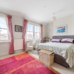 Upstairs, there are two comfortable double bedrooms, both with built-in wardrobes. The principal bedroom is particularly generous, with two large sash windows creating a light and airy feel.
