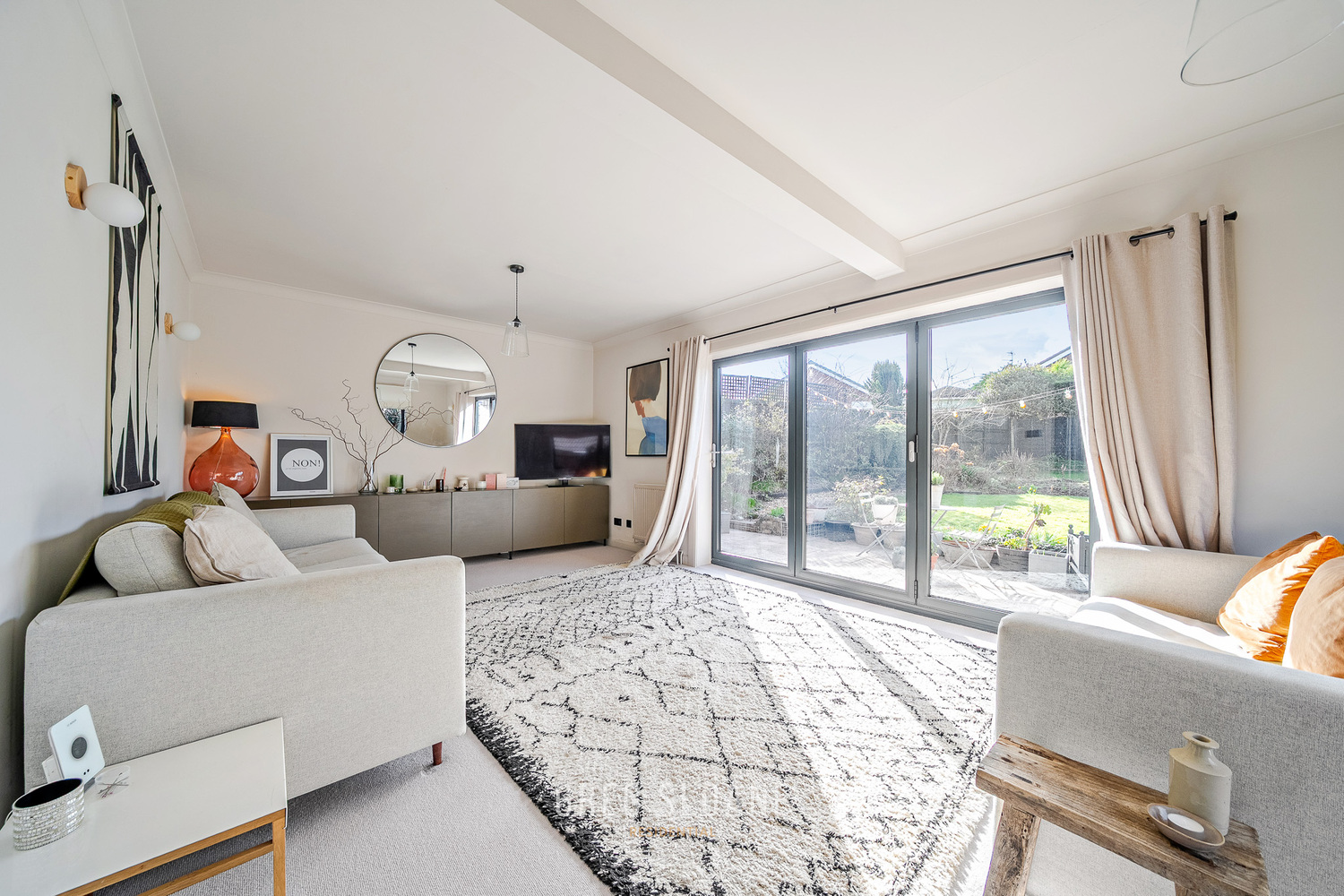 Inside, the proportions are generous. The living room spans the full width of the house – a seriously impressive space that easily accommodates large sofas and family life, with bifold doors framing the garden beautifully.