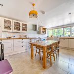 To the other side of the hallway, you’ll find a cosy snug (which could also be a separate dining room) that leads into the kitchen diner – a lovely space for cooking up a storm while hosting guests. Timber worktops and a Belfast sink adorn modern shaker units. There’s a built-in oven, space for a dishwasher and fridge, and even room for your large dresser.