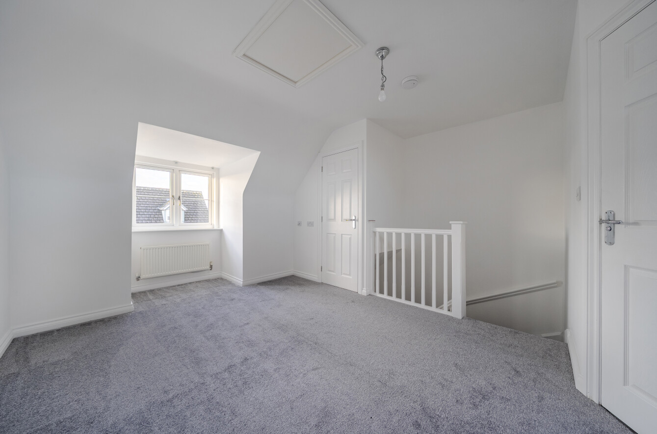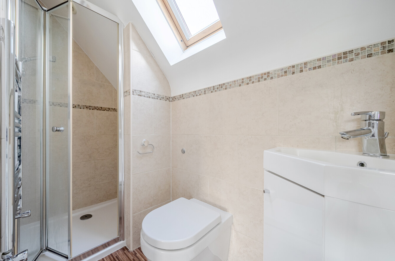 Upstairs, three generously proportioned bedrooms share a contemporary family bathroom, creating a versatile and comfortable living space for family or guests. The principal bedroom occupies the top floor, a bright and inviting suite, a front-facing window and a Velux rooflight that brings in abundant natural light. The stylish ensuite shower room adds a touch of luxury, beautifully finished with quality fittings and a heated towel rail.