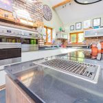 The kitchen is a cook's dream, beautifully appointed with a wide range of contemporary units. It includes an undermount sink with a mixer tap set into the base unit, additional matching cupboards and deep drawers with solid work surfaces, and an integrated dishwasher and fridge freezer with matching facia panels. A central exposed brick wall with a wooden lintel frames twin ovens, a pizza oven, and a microwave, with deep pan and storage drawers beneath.