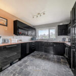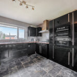 The kitchen, positioned just off the dining area, features black gloss units, ample worktop space and an integrated oven and hob.