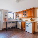 The kitchen is equipped with an Ariston four-ring electric hob, Bosch electric oven, extractor fan, and a Stanley cooker/heating system with a double oven and two hot plates. Additional features include a breakfast bar with two stools, a tiled splashback, and an inset one-and-a-half bowl sink with a mixer tap.