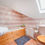Featuring wood-effect vinyl flooring, a Velux skylight, and a three-piece suite comprising a panelled bath with a Triton electric shower, a pedestal hand basin, and a low-flush WC. Fully tiled walls and a built-in storage cupboard complete the space.