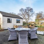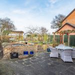 The beautifully maintained rear garden is a particular highlight, enjoying far-reaching views over open countryside. A paved patio provides an ideal space for outdoor dining and entertaining, with steps leading to a charming pathway bordered by a pond and floral beds. A timber-covered seating area offers an additional space for relaxation while taking in the peaceful surroundings. A further lawned area to the rear of the garage is enclosed by mid-height timber fencing and complemented by mature shrubs and herbaceous borders.