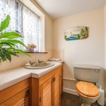 Comprising tiled flooring, a low-flush WC, a hand basin set into a vanity unit, and a UPVC double-glazed window to the side elevation.