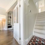 Welcoming entrance with decorative Victorian-style tiled flooring, a door leading into the living area and stairs rising to the first floor.