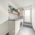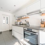 Additional storage and workspace with further base and wall units, sink and drainer, and plumbing for a washing machine and tumble dryer. Wall-mounted gas central heating boiler, two high-level double-glazed windows to the side, and a double-glazed door to the rear courtyard.