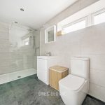 Stylish and spacious, with a large tiled shower enclosure, drench-style shower head and handheld attachment, WC, hand basin with vanity storage, heated towel rail, wall-mounted cabinet, tiled flooring, and a double-glazed window to the rear.