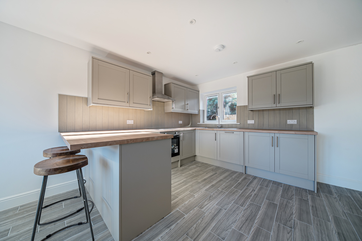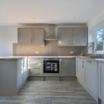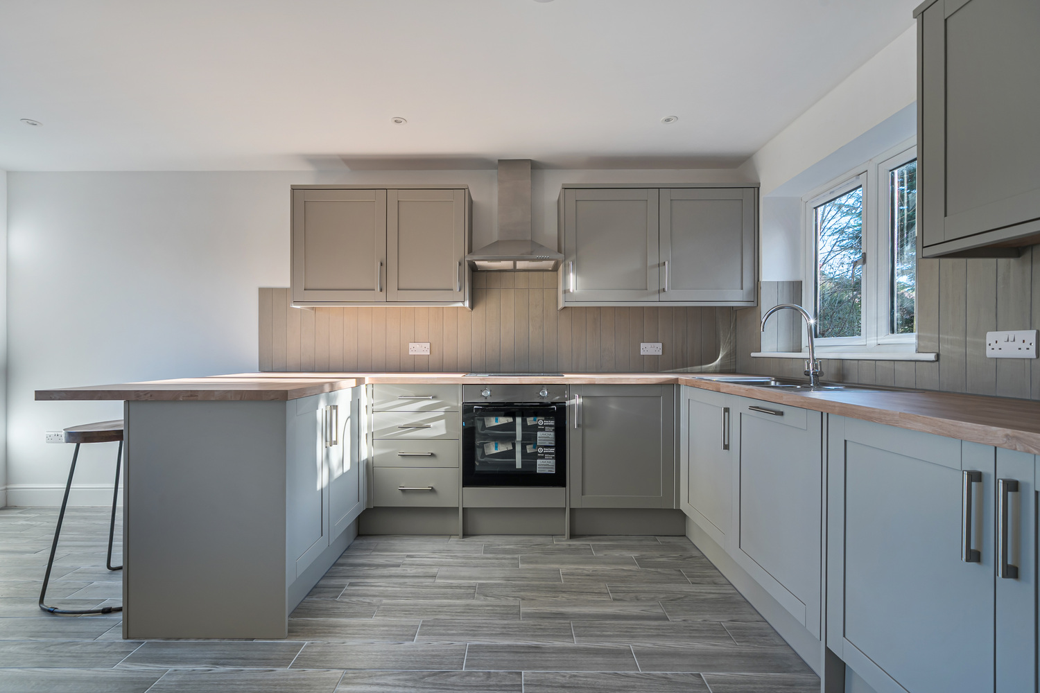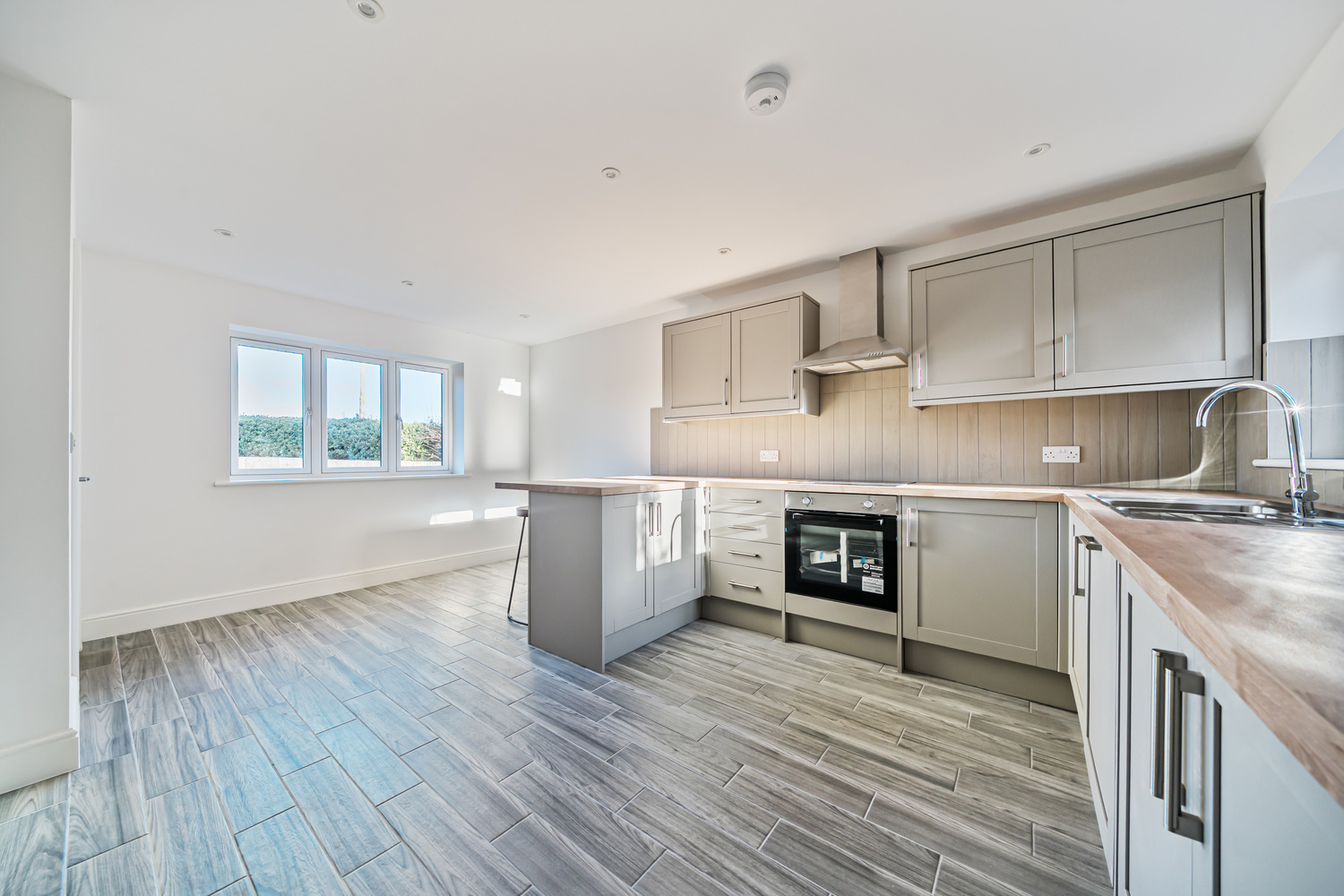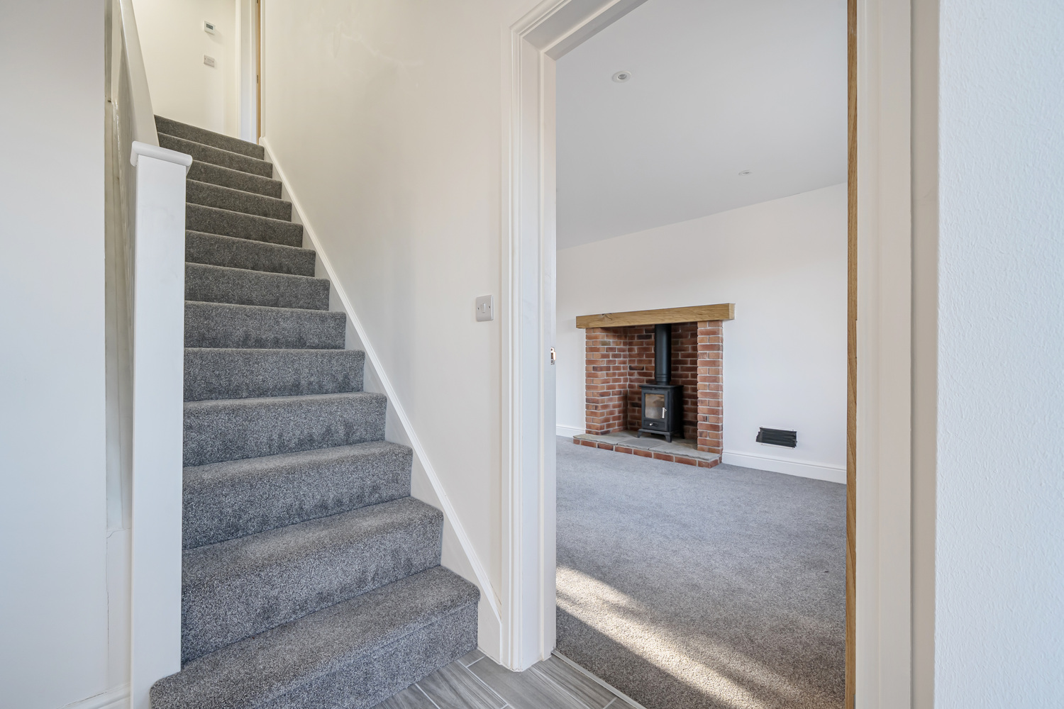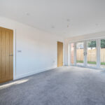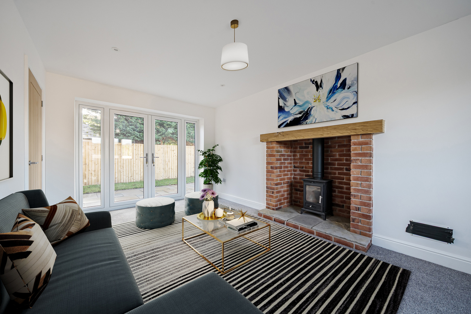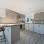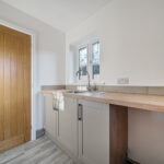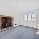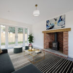 The heart of the home is a sleek Shaker-style kitchen featuring oak-effect worktops, integrated appliances and a sociable breakfast bar — ideal for everyday living and entertaining alike. The kitchen flows seamlessly into a bright dual-aspect living space where French doors open directly onto the garden, allowing natural light to flood the room. A characterful brick fireplace with wood-burning stove adds warmth and charm while complementing the home’s modern efficiency.
