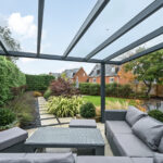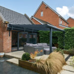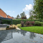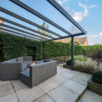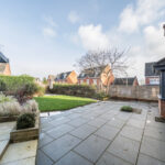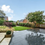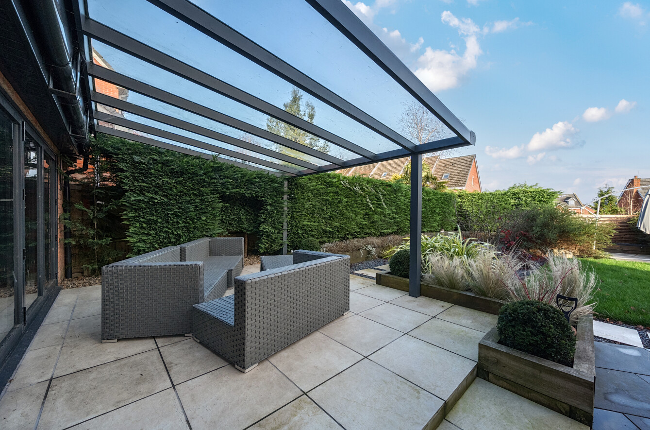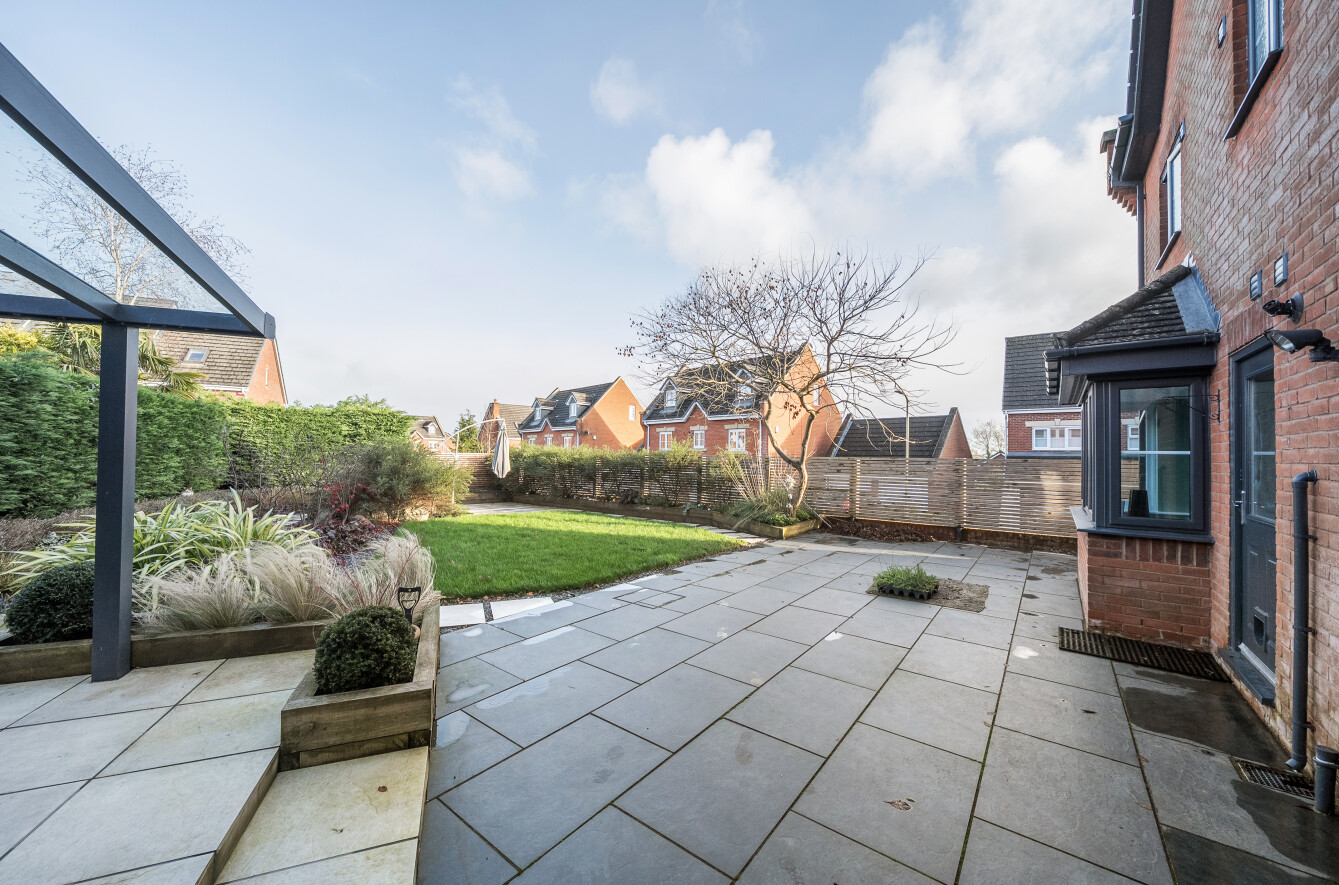To the rear, the garden has been thoughtfully landscaped for low maintenance, featuring spacious paved terraces perfect for alfresco dining, a covered seating area with a glazed roof, and mature, well-screened planting that creates a private and tranquil outdoor retreat.