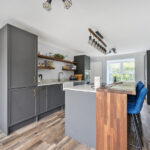 The superb open plan Living, Dining, and Kitchen space forms the true heart of the home. Recently refitted, this impressive area is designed for both everyday life and entertaining, featuring a sleek range of grey fronted cabinetry, solid worktops, integrated appliances, and a statement breakfast island, the perfect spot for gathering with friends and family. Large sliding doors seamlessly connect the interior to the sun terrace and landscaped garden, creating a wonderful indoor and outdoor flow.