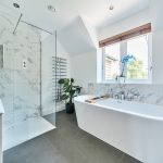 As you’d expect from a home of this calibre, the bathrooms are finished to an exceptional standard. The main bathroom features striking granite-effect tiles, a large walk-in shower, and a separate bath – perfect for both a quick morning dash and a long evening soak. The attention to detail, from the fittings to the lighting, gives it a real boutique-hotel feel.