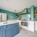 The modern kitchen is both beautiful and functional, featuring cream high-gloss units, a five-ring gas hob, a traditional-style stove, and French sliding doors that bring the garden into the home. A separate utility room adds practicality, while a cloakroom completes the ground floor.